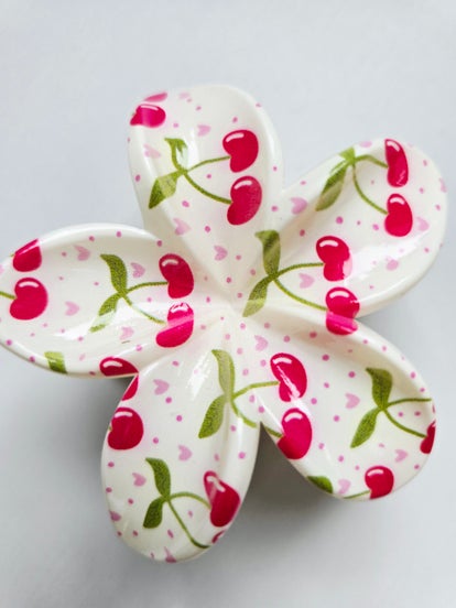 Dodaj wyjątkowy akcent do swojego stylu dzięki naszej eleganckiej spince do włosów typu klamra. Ta urocza ozdoba przedstawia delikatny kwiatek w klasycznym białym kolorze, ozdobiony subtelnym wzorem wisienek i kropeczek, które dodają mu słodkiego i romantycznego charakteru. Idealna na co dzień i specjalne okazje, ta spinka nie tylko utrzyma Twoje włosy w perfekcyjnym porządku, ale także podkreśli Twój niepowtarzalny styl. Wykonana z wysokiej jakości materiałów, jest trwała i wygodna w noszeniu. Odśwież swoją fryzurę i poczuj się wyjątkowo każdego dnia!