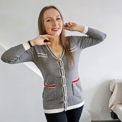 Rozpinany sweterek z dekoltem w serek. Posiada małe kieszenie.