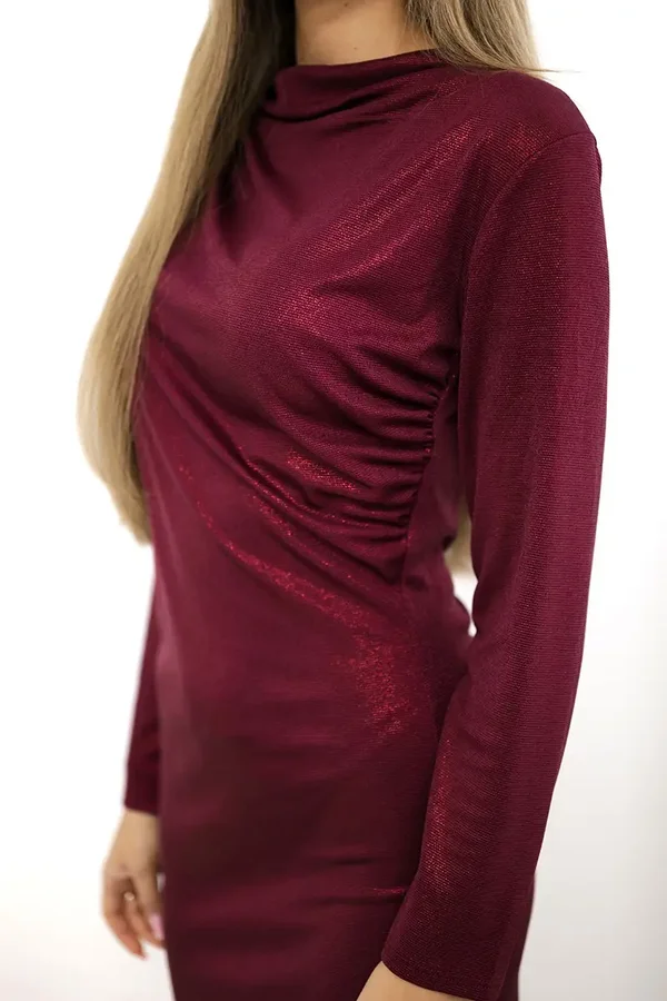 Odkryj naszą elegancką bordową sukienkę, która zachwyca swoim dopasowanym krojem i błyszczącym materiałem. Ta wyjątkowa sukienka jest doskonałym wyborem na święta, różne imprezy oraz wieczorne wyjścia, zapewniając Ci niezapomniany wygląd i pewność siebie.