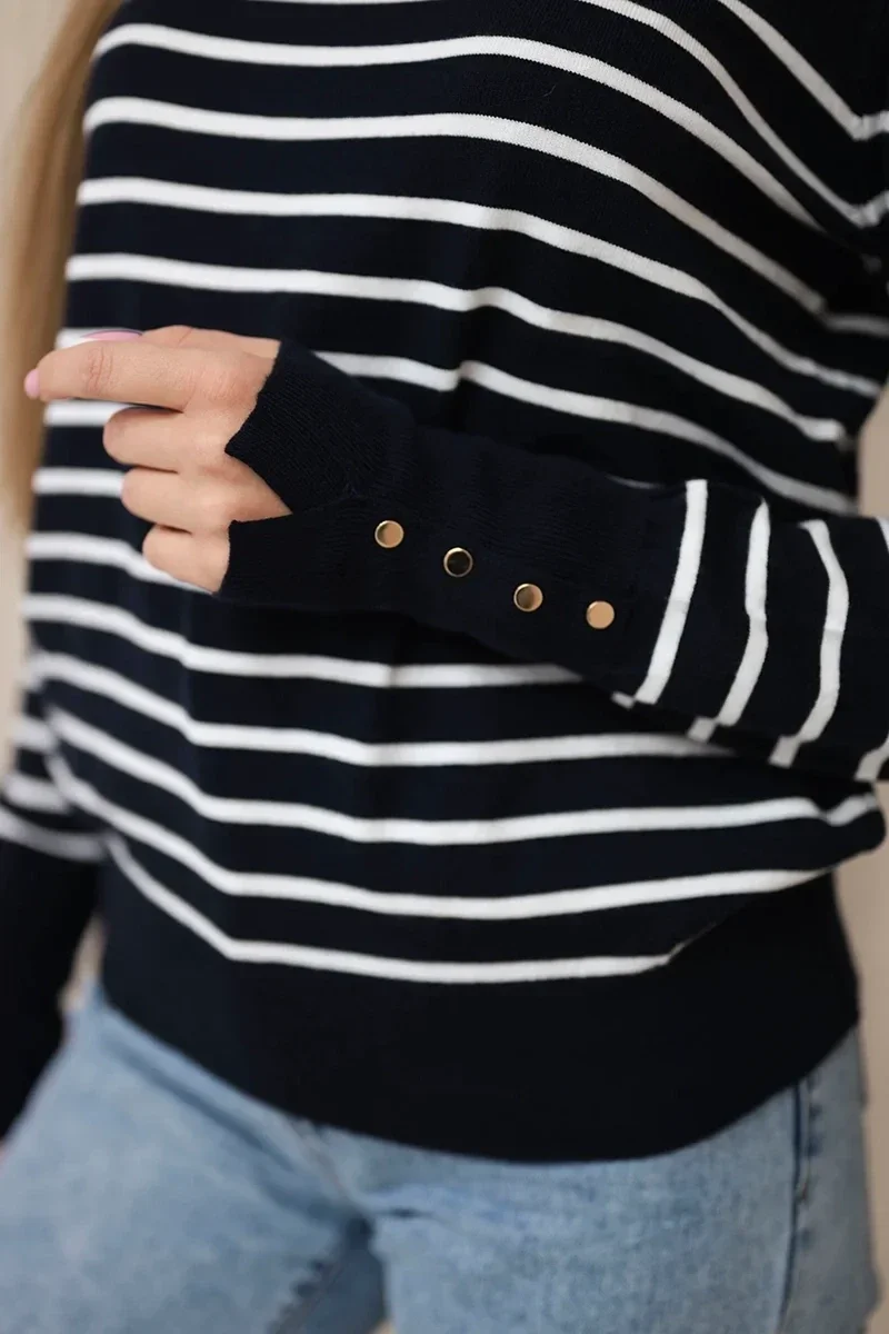 - **Stylowy design:** Klasyczny granatowy kolor w modne paski sprawia, że sweter idealnie wpisuje się w najnowsze trendy, a jednocześnie pozostaje elegancki i uniwersalny.