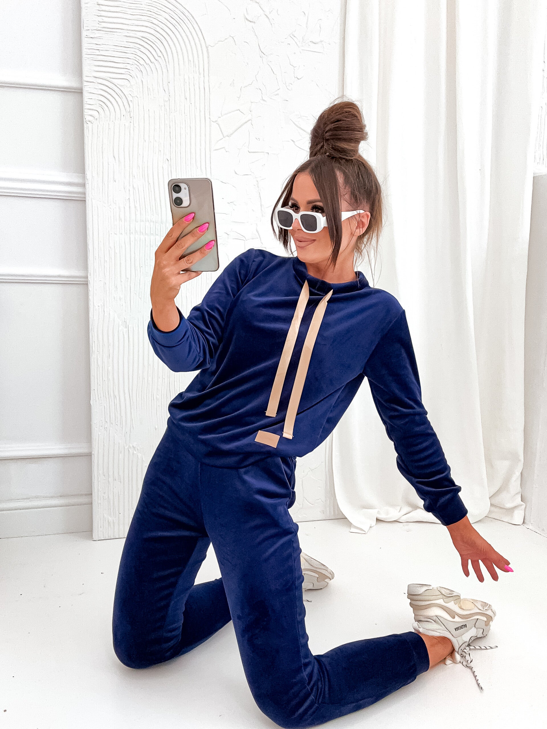 Komplet welurowy w kolorze granatowym to elegancka i jednocześnie wygodna propozycja dla osób ceniących sobie styl oraz komfort. Bluza, wykonana z miękkiego weluru, ma klasyczny krój, co sprawia, że doskonale wpisuje się w trendy streetwearowe. Beżowe troczki dodają jej świeżości i kontrastu, a jednocześnie nadają całości przytulnego charakteru.