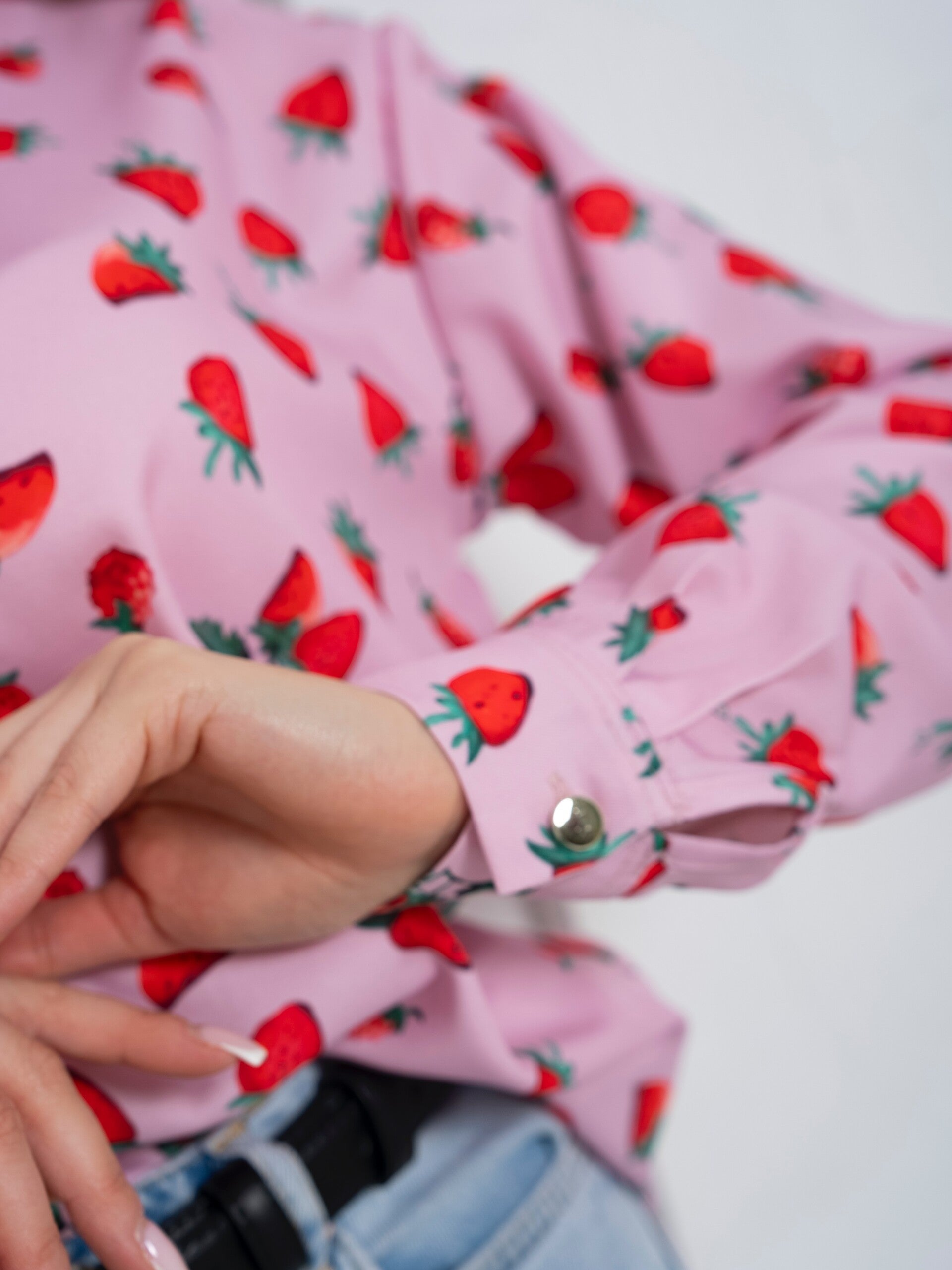 Odkryj naszą urokliwą koszulę w różowe truskawki, która doda świeżości i lekkości każdej stylizacji. Wykonana z wysokiej jakości materiałów, łączy w sobie komfort noszenia z modnym designem.
