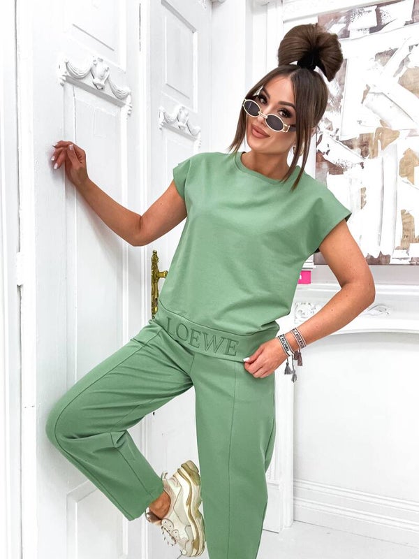 **Bluzka**: Krótki rękaw idealnie komponuje się z spodniami, tworząc zgrany duet. Na dole bluzki znajduje się haftowany napis "LOEWE", który nadaje całości wyjątkowego stylu i klasy.