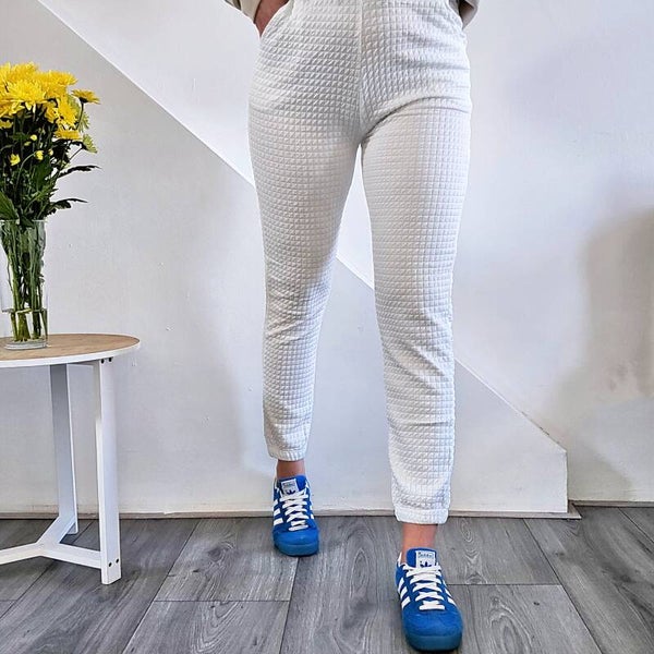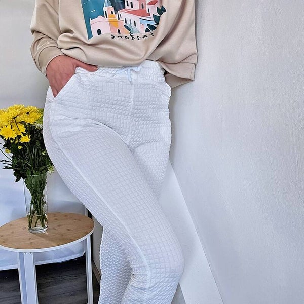 Odkryj wygodę i styl z naszymi spodniami dresowymi, które idealnie sprawdzą się zarówno w codziennych stylizacjach, jak i podczas aktywności sportowych. Wykonane z wysokiej jakości materiału z subtelną wytłoczoną kratką, te spodnie łączą funkcjonalność z modnym designem.