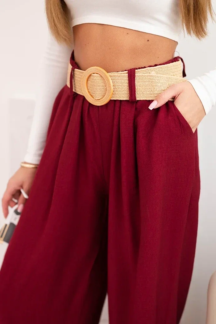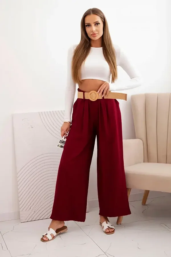 Odkryj nasze najnowsze spodnie w najmodniejszym fasonie sezonu! Zaprojektowane z myślą o komfortowym noszeniu i stylowym wyglądzie, te spodnie wyróżniają się rozszerzaną nogawką, która dodaje im lekkości i elegancji. W pasie zastosowano gumkę oraz pasek, zapewniając idealne dopasowanie i wygodę na co dzień. Wykonane z wysokiej jakości wiskozy, są nie tylko przyjemne w dotyku, ale także przewiewne i trwałe. Modny bordowy kolor dodaje charakteru każdej stylizacji — idealne zarówno na casualowe spotkania, jak i bardziej eleganckie okazje. Postaw na styl i komfort w jednym!