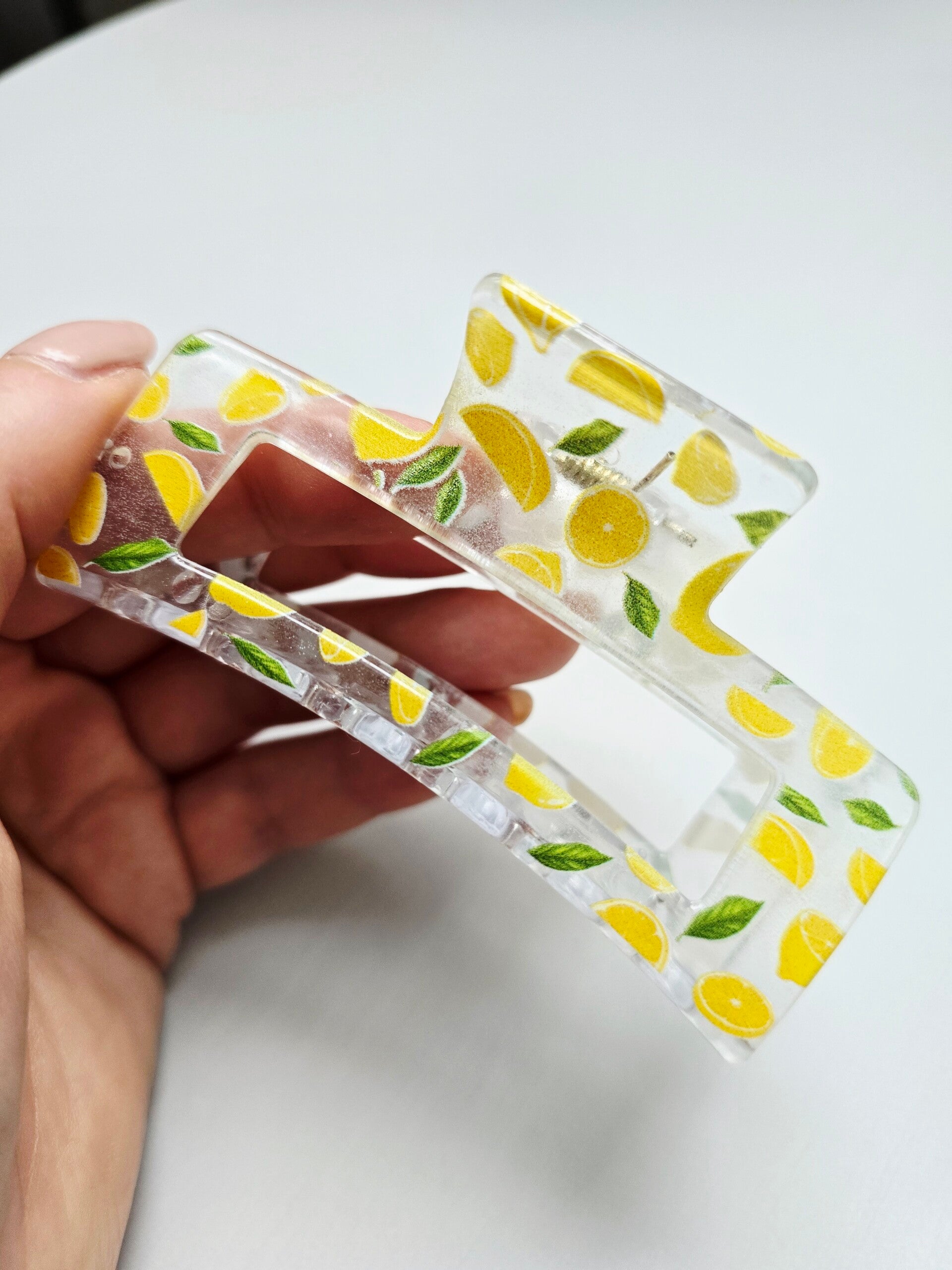 Dodaj odrobinę elegancji i subtelności do swoich stylizacji dzięki naszej spince do włosów w klasycznym prostokątnym fasonie. Przeźroczysta, ozdobiona delikatnym wzorem w cytrynki, stanowi idealne uzupełnienie zarówno codziennych, jak i bardziej eleganckich kreacji. Funkcjonalna i stylowa, sprawdzi się na wiele okazji, podkreślając Twój wyjątkowy gust.
