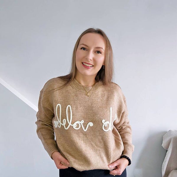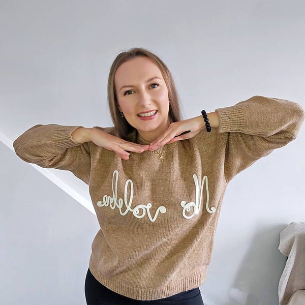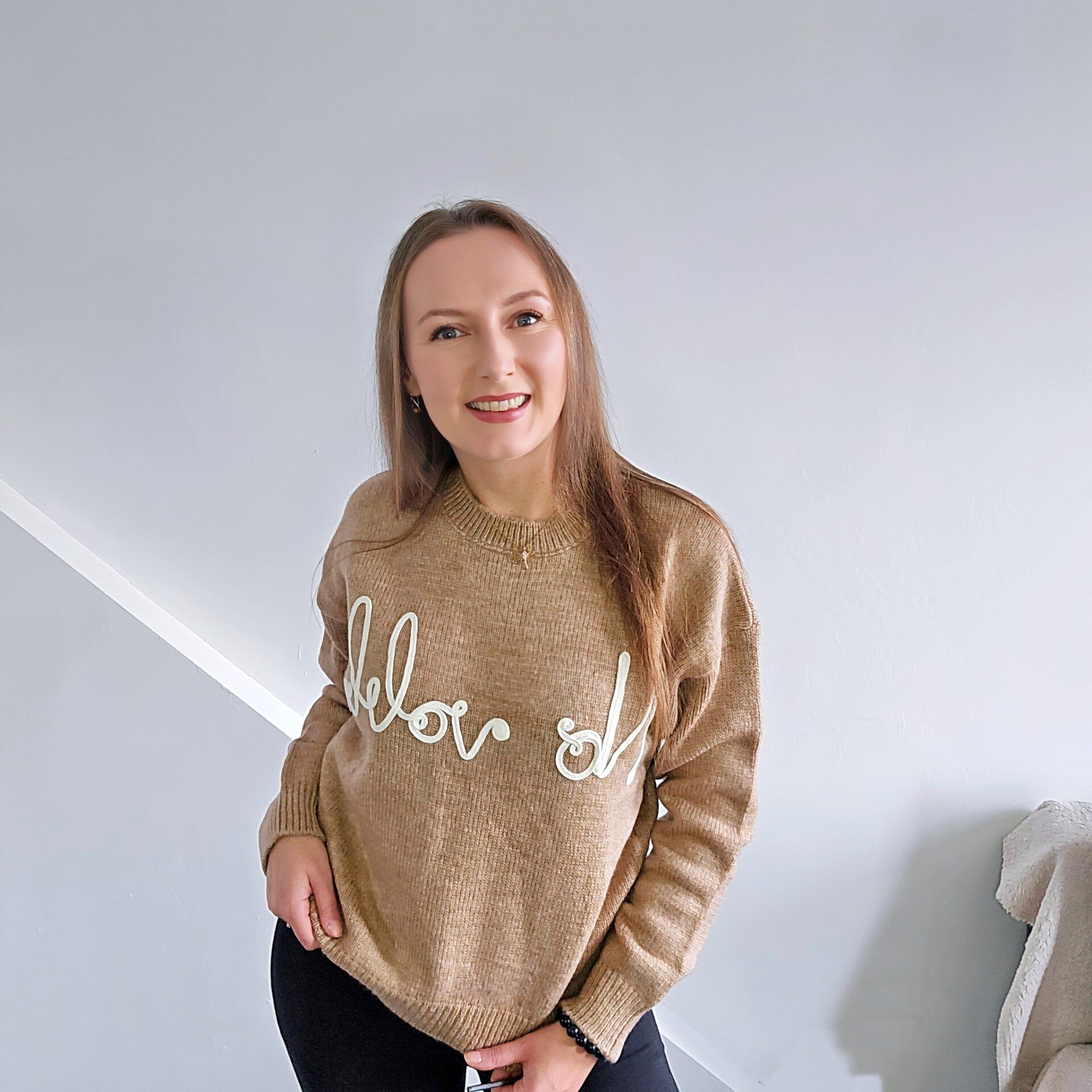 Beżowy sweter z naszytym napisem – klasyczny fason