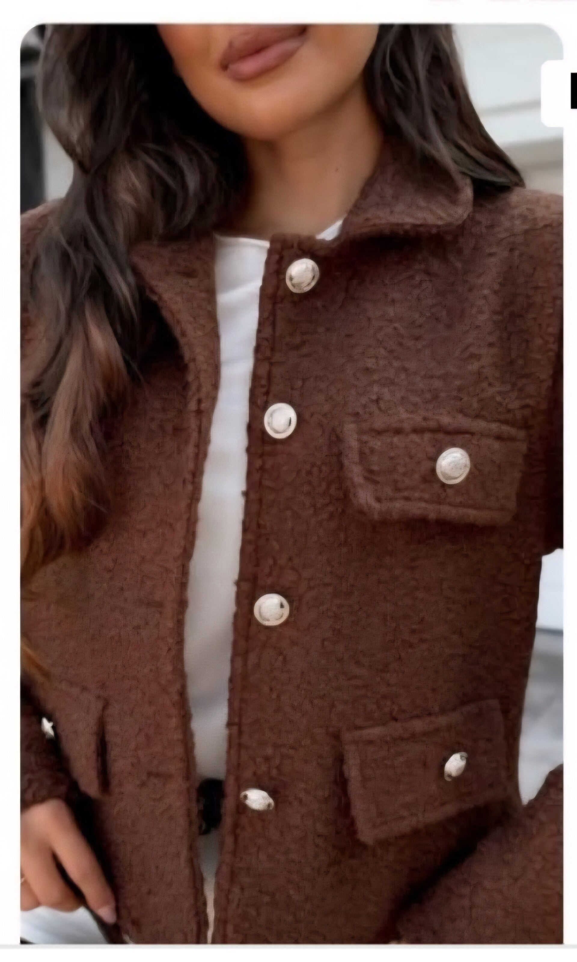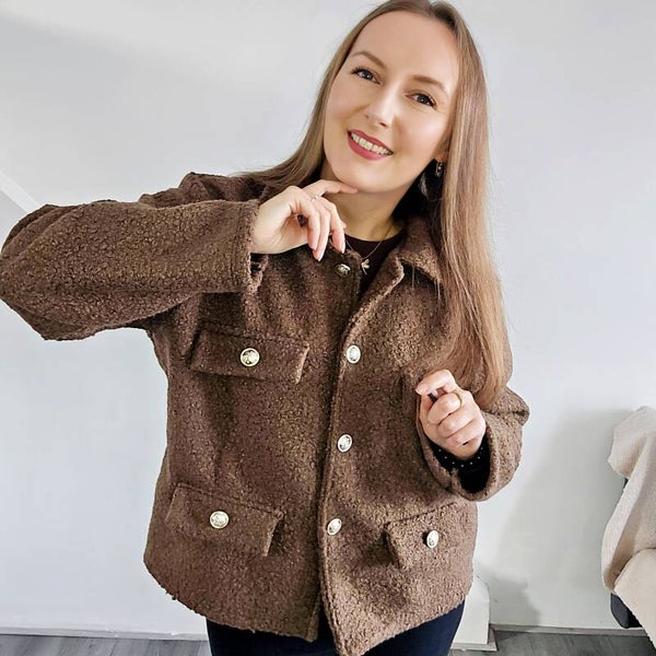 Ta kusząca kurtka ma klasyczne, modne wykończenie w ciepłym brązie, które świetnie komponuje się zarówno z casualowymi, jak i bardziej eleganckimi zestawami. Zapięcie ozdobne guziki w kolorze srebra nadaje całości subtelny, luksusowy charakter.