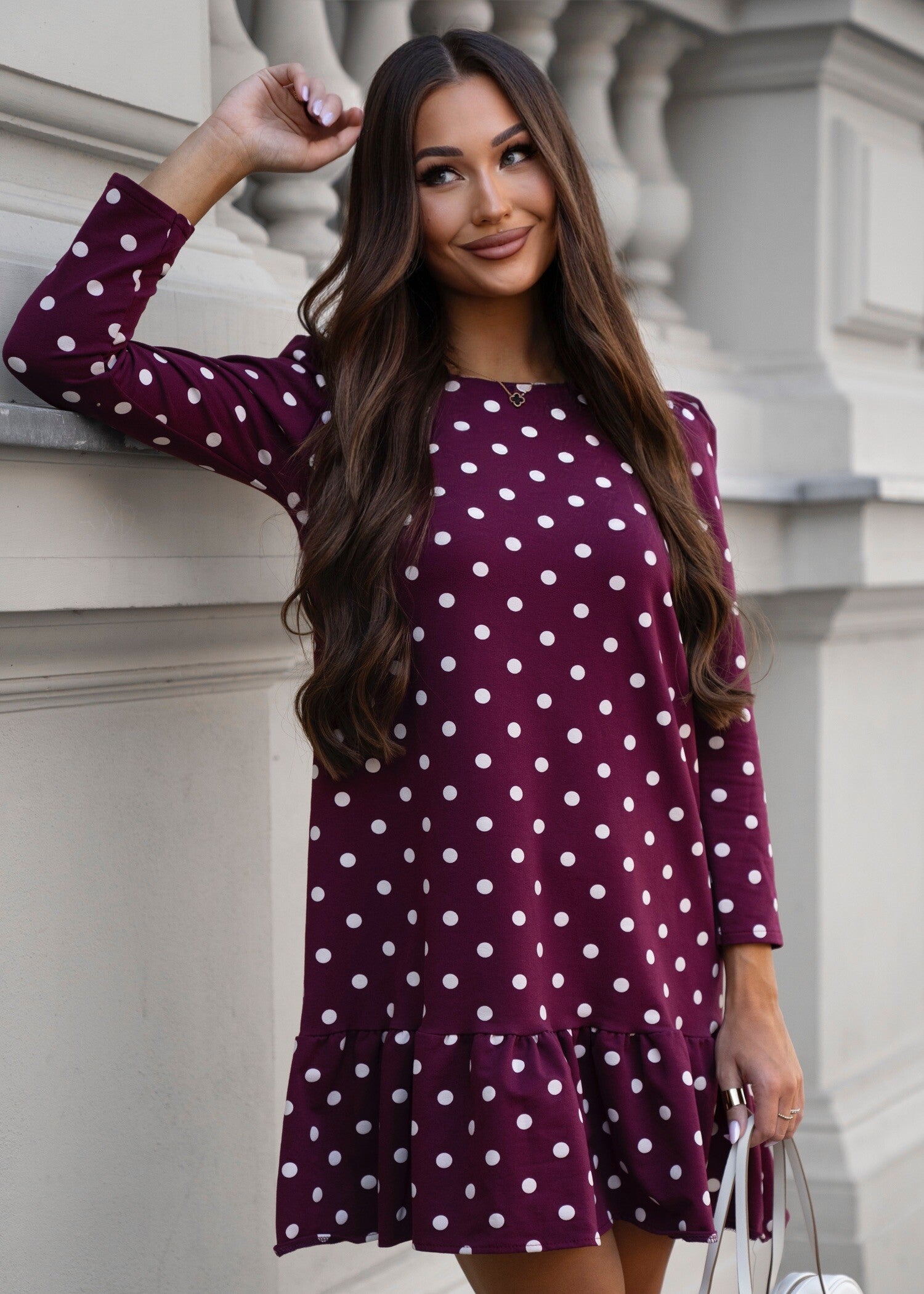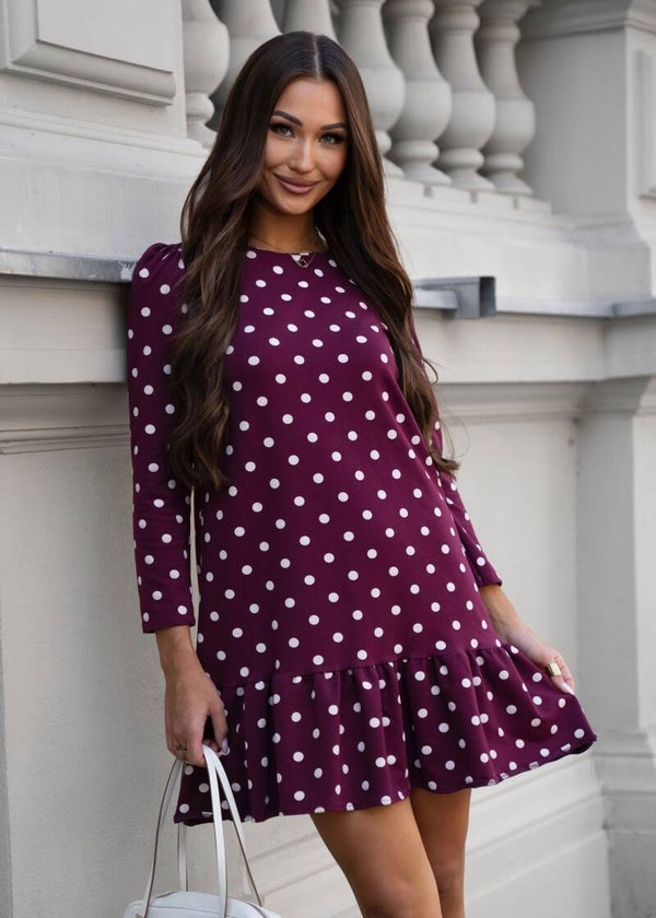 Odkryj naszą elegancką sukienkę bawełnianą w najmodniejszym bordowym odcieniu z uroczymi białymi grochami. Ta stylowa kreacja wyróżnia się luźniejszym, komfortowym fasonem, który zapewnia swobodę ruchów i świetnie podkreśla kobiecą sylwetkę. Długi rękaw i delikatna falbankowa ozdoba u dołu dodają jej subtelnego uroku i romantycznego charakteru. Sukienka świetnie wygląda zarówno w casualowych, jak i bardziej eleganckich stylizacjach — wystarczy dodać pasek, aby podkreślić talię i nadać jej wyjątkowego szyku. Idealna na co dzień i wyjątkowe okazje!