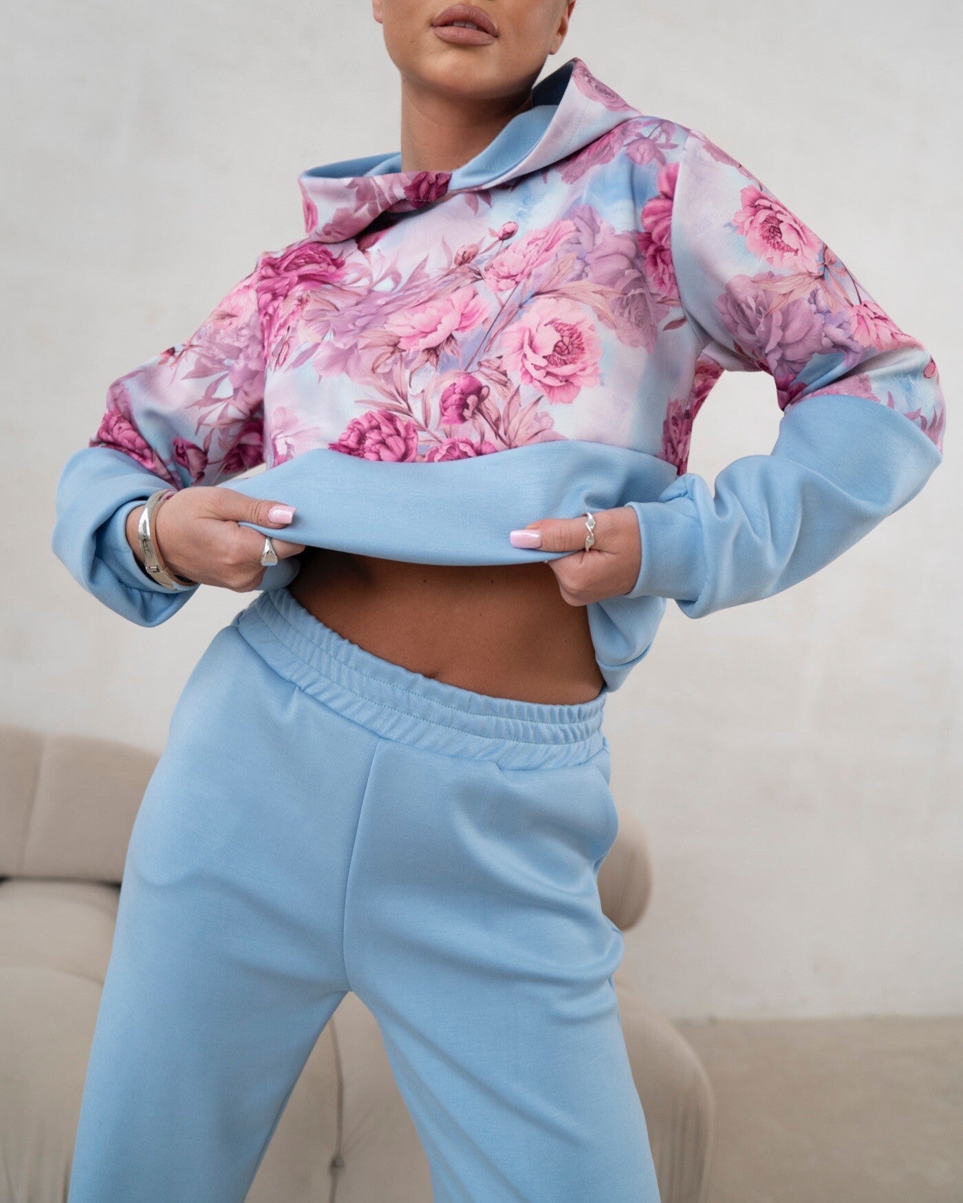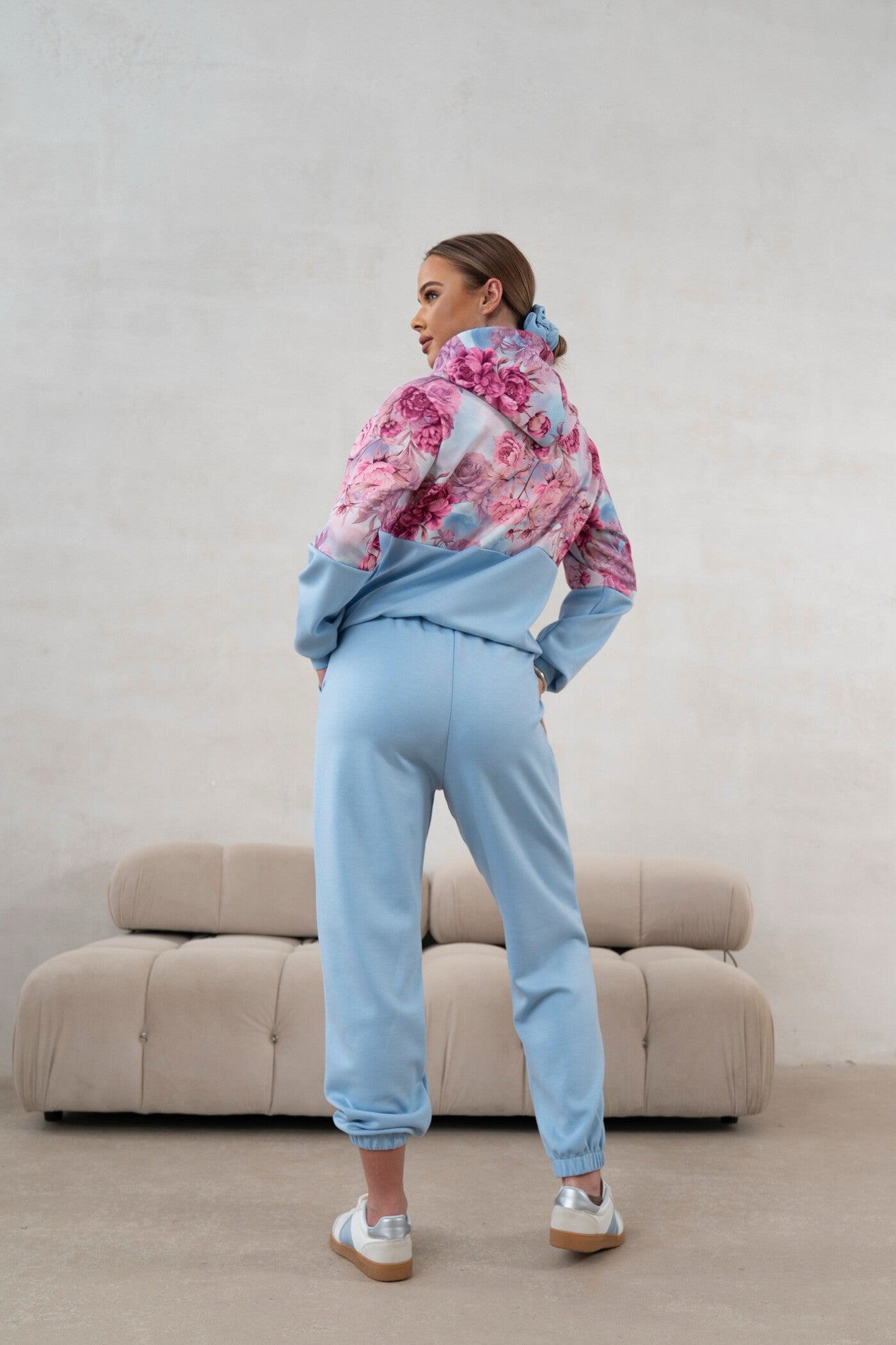 Odkryj nasz stylowy komplet dresowy, stworzony z najmodniejszego materiału typu "masełko", który zapewnia niezwykłą miękkość i komfort noszenia. Zestaw składa się z luźnej, wygodnej bluzy z kapturem ozdobionej piękną grafiką kwiatów, dodającą mu kobiecego i świeżego charakteru. Do kompletu dopasowane są komfortowe spodnie z elastyczną gumką w pasie, wyposażone w praktyczne kieszenie. Nogawki spodni zostały wykonane w luźnym kroju, zakończone ściągaczami, co podkreśla casualowy styl i zapewnia idealne dopasowanie. To idealny wybór na co dzień, gwarantujący wygodę i modny look!